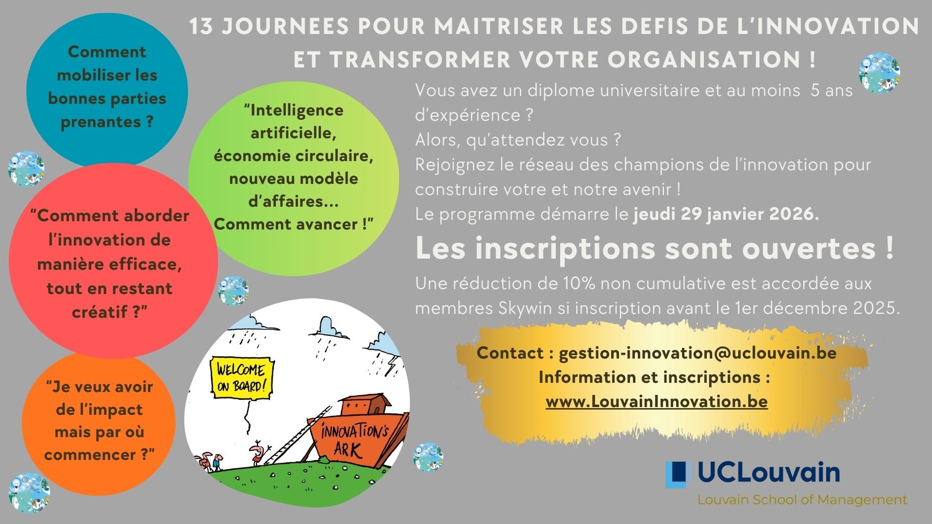 Skywin soutient à nouveau le programme en Gestion de l’Innovation organisé par la Louvain School of Management (UCLouvain). Ce programme, destiné aux cadres, responsables R&D, chefs de projet et dirigeants, vise à renforcer les compétences stratégiques et opérationnelles nécessaires pour piloter efficacement l’innovation au sein des entreprises technologiques.